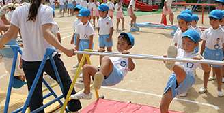 毎日リトミックからはじまり体の全てを使っていろいろな用具を工夫してサーキット活動をして園庭せましと走りまわります。